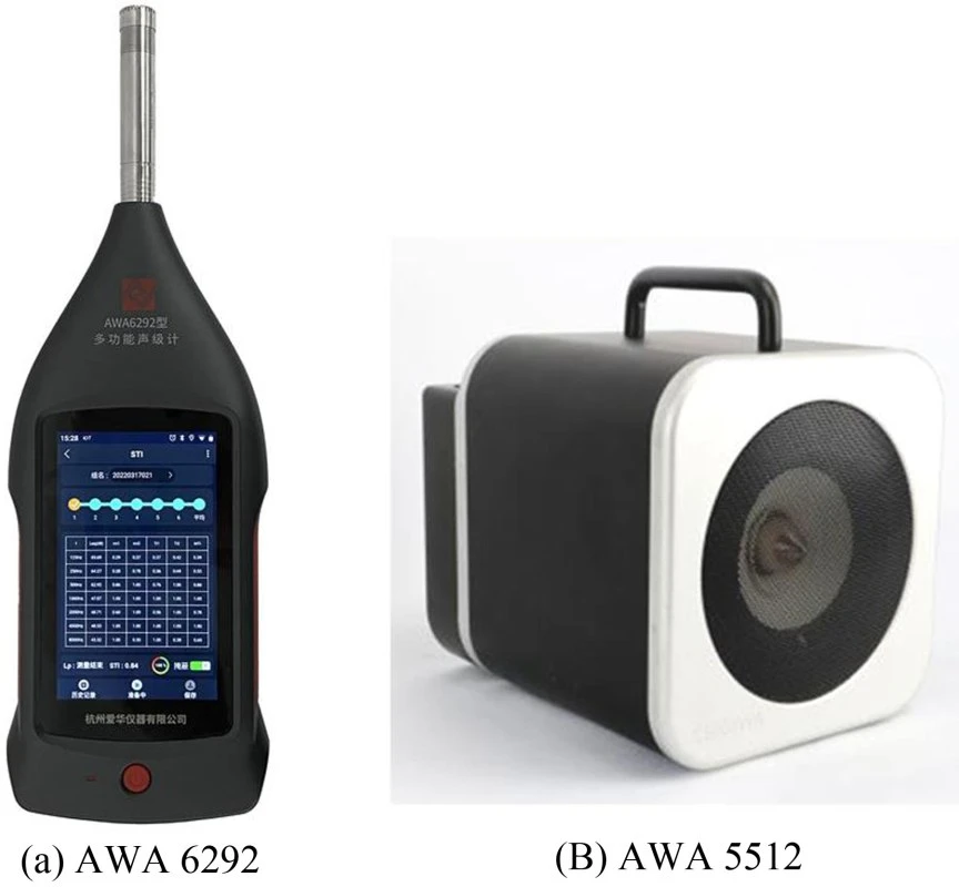 AWA6292型多功能声级计如图2(a)所示,是采用数字信号处理和物联网技术的新一代手持式声学测量仪器,性能符合GB/T 3785 香蕉视频,1/IEC 61672-1对1级声级计和GB/T 3241,1/IEC 61260-1对1级滤波器的要求,可以选择工业噪声测量、环境噪声测量、职业卫生噪声测量和建筑声学测量等模块。当选用建筑声学测量模块时,配置总值积分测量、倍频程和1/3倍频程滤波器、混响时间测量和STIPA测量等软件模块,可以完成大多数建筑声学测量项目,尤其适用于厅堂和室内场所的声学和扩声特性测量。。